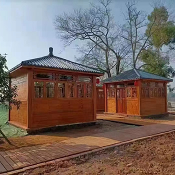 這是一款餐飲店木屋,是四角樹脂瓦木屋,也可以做成瀝青瓦木屋,客人可以坐在木屋里吃飯,這種木屋做為包廂作用,可以做成四角的木屋、六角的木屋都可以,可以來圖定制。